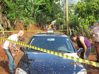 O assassino esfaqueou o taxista, provavelmente o colocou no banco do carona e tentou se livrar do corpo. Só que como havia chovido no local, o carro não subiu o morro. Deslizava bastante. O carro foi então abandono cerca de 100m acima de onde o corpo da vítima foi jogado. Dentro da estrada.